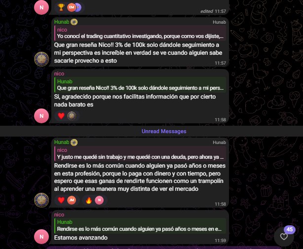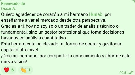 Hoy, Hunab se destaca como Trader institucional, formador y especialista en modelos operativos, liderando procesos de inversión, gestión de portafolios, educación financiera y desarrollo de sistemas cuantitativos. Su enfoque une visión institucional, análisis estadístico, comprensión estructural del mercado y una pedagogía clara basada en datos y transparencia.